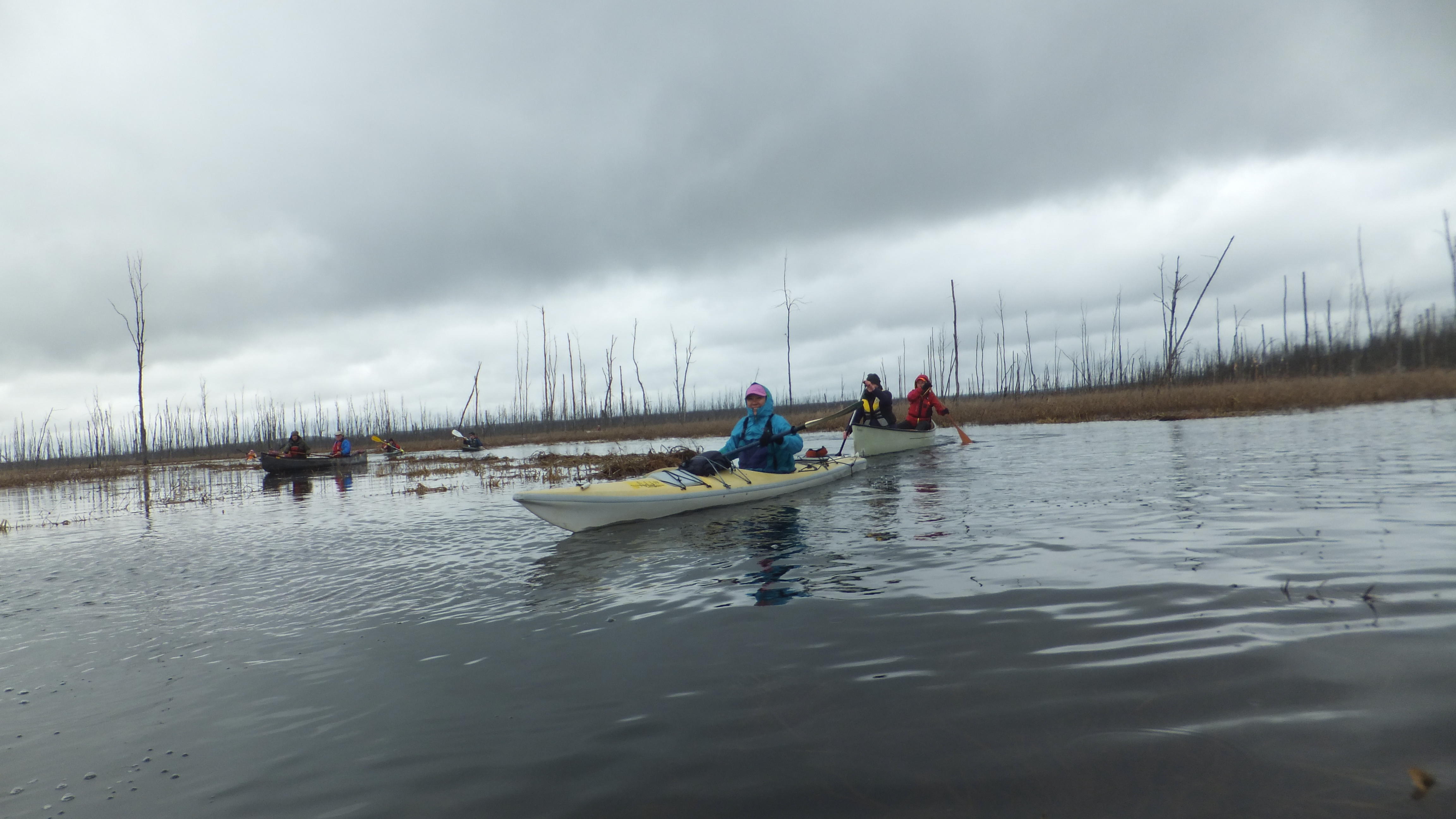 We were with 9 canoes with 2 or more people in it and 8 Kayaks/solo canoes. We were there with 26 people. A very large group for a cloudy, drizzling day.