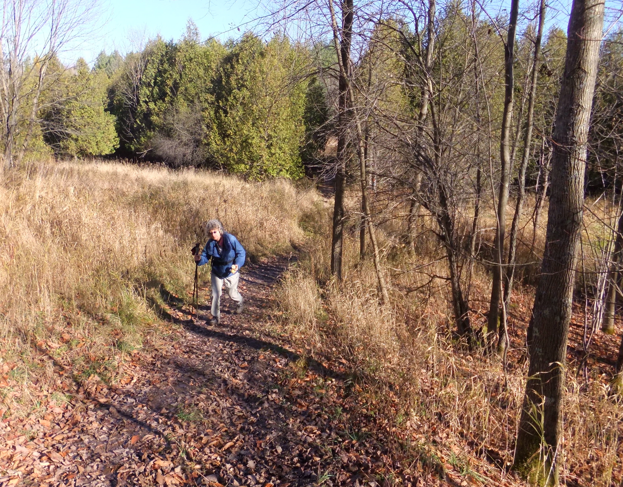 Saturday started off cool but warmed up quickly. Our 16 km hike to the Kolapore uplands was followed by a pot luck supper (where 17 of us squeezed around the farmhouse table), singing/guitar playing (courtesy of Bruce Bellaire) and charades. The regulars (Diane Lucas, Rick Sabourin, Bruce & Beth Bellaire, Barb & Dave Young, Mary Perkins, Faith Hughes, Johanna de Bruijn & Bear) welcomed newbies (Rick & Maaike Nonnekes, Elizabeth Barker, Dave & Dawne Robinson, Jon McPhee & Dian Connors, Scott Campbell).