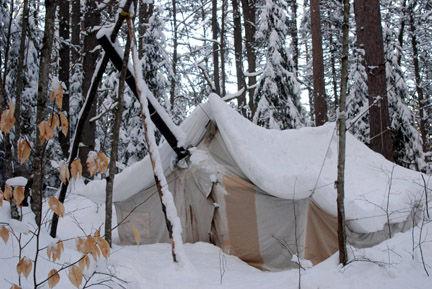 We rescued our winter tent from that last 18inch snowfall beginning of March, breaking trail 14K more than 24 inches deep, up the Barron River from the bridge (because AFA stopped plowing early), && that beautiful long long Canyon, then sections on thin ice to avoid getting tangled in alders impossibly up to our tits in snow, left at 7 a.m. arrived at 6 p.m. u should have heard me when I keeled over, ripped the snowshoe bindings right off, pulled various feet muscles ... got snow up to my armpits, lost 1 glove ... struggling to get out of a crazy angle worse than a beached walrus ... and Frank - 'out of hearing range' @#!!!!!